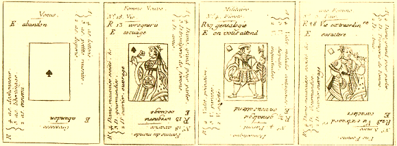 現在では、「トランプ占い」というと、俗っぽいような印象を抱いてしまいがちですが、エテイヤにとっては、このトランプこそが、1枚1枚のタロットカードの数札に、占い上の意味をたぐりよせる事ができた、唯一のツールでした。